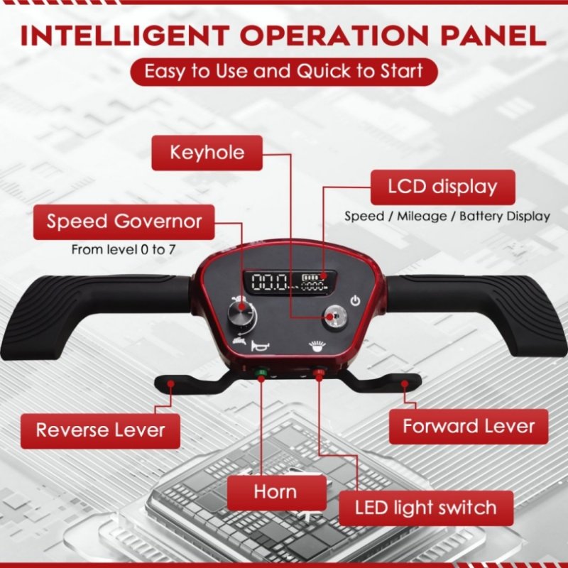 INTUITIVE CONTROLS: A bright LCD display shows your speed, mileage, and battery life. With a simple forward/reverse lever and a 7-level speed governor, it’s incredibly easy to operate.